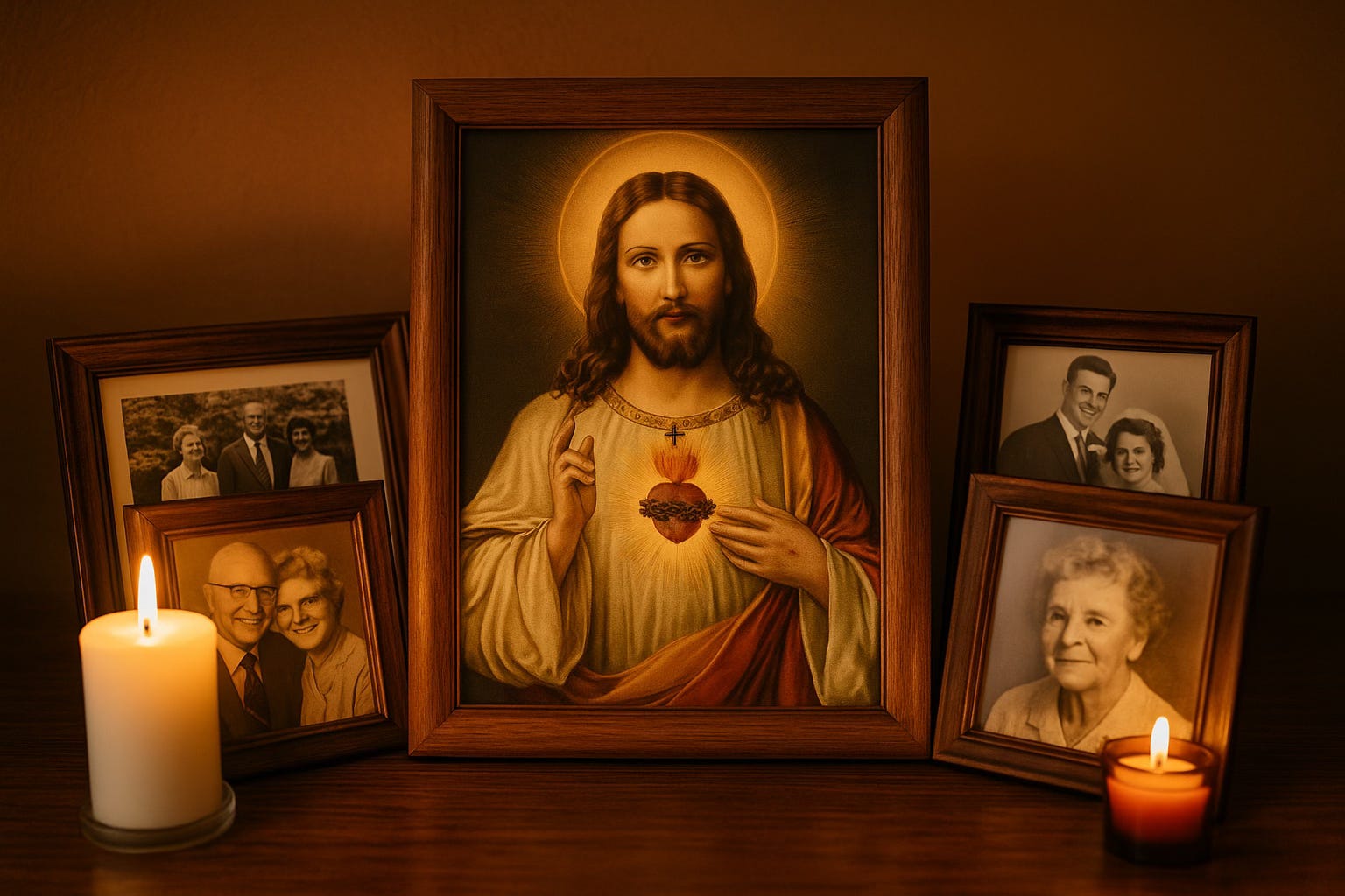 Consider placing photos of your departed loved ones near your image of the Sacred Heart. This creates a sacred space of remembrance — a visual reminder that Jesus reigns not only in our homes, but also in our families across time and eternity.